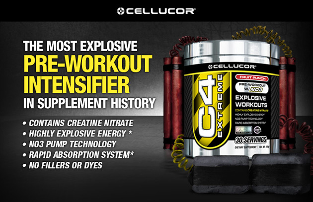 Препарат C4 Extreme - это источник энергии в форме порошка. Созданный с применением уникальной передовой технологии NO3 и эксклюзивных высококачественных ингредиентов, таких, как Креатин Нитрат (Creatine Nitrate), препарат C4 Extreme более эффективный, чем любые другие предтренировочные комплексы в своем классе, наполнит взрывной энергией ваше сознание, мышцы и позволит увеличить интенсивность занятий от тренировки к тренировке.Соединение NO3 – это нитрат, совершенная формула, которая буквально накачивает энергией ваши мышцы и одновременно усиливает эффективность каждого ингредиента препарата C4 Extreme. Компания Cellucor применяет новое соединение NO3 и Креатина с образованием Креатин Нитрата; согласно результатам масштабных научных исследований Креатин нитрат на 1000% лучше растворяется в воде, чем Креатин моногидрат или другие производные креатина. Свойство превосходной растворимости в воде обеспечивает наилучшую усвояемость и полное отсутствие традиционных побочных эффектов применения пищевых добавок с креатином.