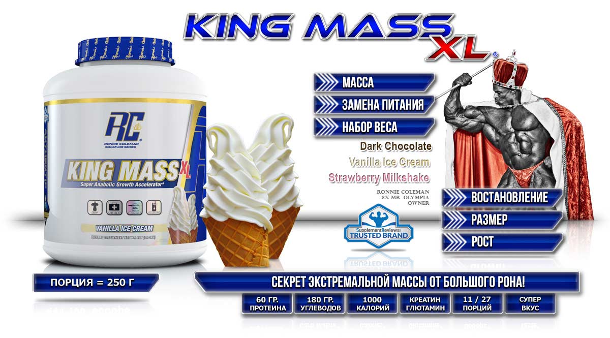 Если твоя цель масса - ты должен пахать за четверых. Никаких компромиссов и жалости к себе. Но когда твой рацион страдает от недостатка белка или углеводов, то единственное, что ты получишь вместо роста это усталость, перетренированность и, как результат, сильнейший откат в массе и силовых. Теперь ты понимаешь, почему тебе нужен именно King Mass XL. С этим заряженным гейнером, у тебя просто нет права оставаться худым! |